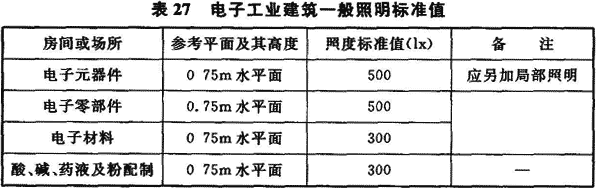 12.2.1 根據現行國家標準《建筑照明設計標準》GB 50034—2004中的規定,照度值均為作業面或參考平面上的維持平均照度值。該標準第5章中規定了各類建筑的照明標準值,現將其中有關電子工業的部分摘錄于表27中。