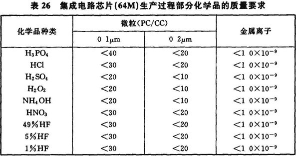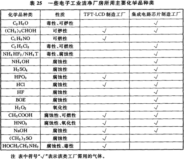 11.1.1 電子工業(yè)潔凈廠房常常需使用各種化學品,根據(jù)電子產(chǎn)品品種及其生產(chǎn)工藝的不同,各種電子產(chǎn)品生產(chǎn)所使用的化學品是不相同的,其中以集成電路芯片制造過程、TFT—LCD生產(chǎn)過程所需的化學品品種多,有的純度要求嚴格,表25是這兩種電子產(chǎn)品生產(chǎn)用潔凈廠房內所用的主要化學品種類。表26是有關資料提出的集成電路芯片64M生產(chǎn)過程部分化學品的質量要求。
