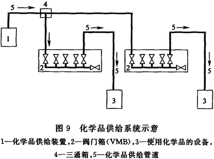 11.3.3 對一些使用多種化學品的管道供應系統(tǒng)的國內電子工業(yè)潔凈廠房的調查和相關的技術資料介紹表明,為確?;瘜W品供應輸送系統(tǒng)的安全和有利于連接多臺生產(chǎn)設備共用一條管路系統(tǒng),一般在液體化學品供應系統(tǒng)中設有化學品供應分配閥箱(Valve Manifold Box,簡稱VMB,如圖9所示)。故作本規(guī)定。