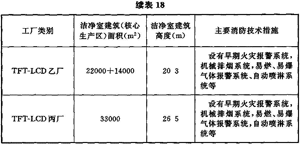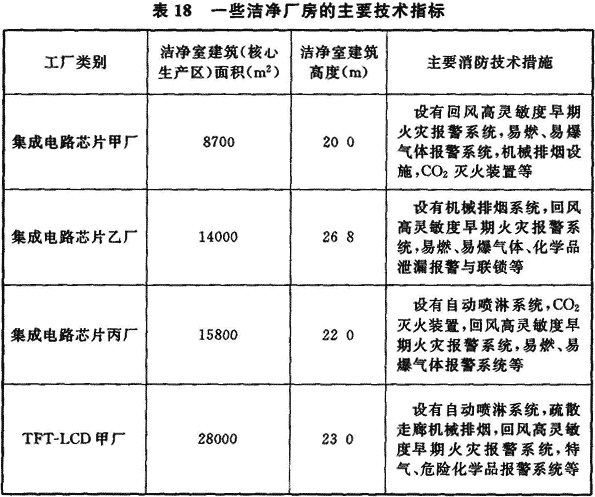 6.2.3 從20世紀90年代末以來,我國建設了一批大規模集成電路芯片生產用潔凈廠房、TFT-LCD生產用潔凈廠房,它們的潔凈室面積和防火分區面積均大大超過現行國家標準《潔凈廠房設計規范》GB 50073、《建筑設計防火規范》GB 50016規定的面積。這些芯片制造、TFT-LCD制造為代表的高科技潔凈廠房具有大面積、大體量的特點,如表18所列的國內8″~12″芯片生產潔凈廠房潔凈區面積從6500m2~16000m2,第五、六代TFT-LCD生產用潔凈區已達36000m2,第八代TFT-LCD已達90000m2。這類潔凈廠房通常由潔凈生產區和潔凈生產區各自設有的上下技術夾層構成,廠房高度約為20~30m。由于芯片制造、TFT-LCD制造的生產工藝設備體量大,制造過程的連續性和自動化傳輸,所以生產工藝區是不能分隔的。為加強消防技術措施,在美國消防標準NFPA 318((潔凈室消防標準》中要求采用高靈敏(≤0.01%obs/m)早期空氣取樣式煙霧探測系統,在環境空氣中煙霧濃度很低的火情出現初期,探測系統即發出警報,相應消防應急系統即可啟動將火情消滅在初始階段;據了解,國內外的此類高科技潔凈廠房都這樣設計建造,投產最早的已有十年以上。