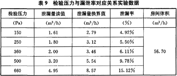實驗條件:空氣壓縮機充氣壓力為0.2MPa,分別將潔凈室壓力保持在150Pa、250Pa、360Pa、500Pa和660Pa進行恒壓法氣密性實驗,測試過程中溫度基本保持不變,忽略溫度因素影響,受檢驗儀器量程(浮子流量計最小量程為1.6m3h)限制,檢驗壓力小于150Pa時沒有做漏泄率實驗。實驗結果如表9所示,其中泄漏量讀值為流量計讀數平均值,泄漏量換算值為泄漏量讀值經修正后的數值。可以看出,檢驗壓力(即潔凈室壓差)越大,潔凈室漏泄率增長越迅速。
