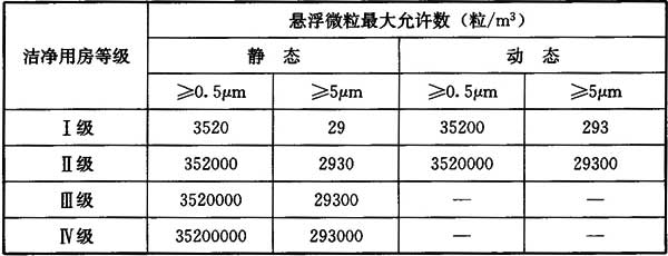 4.2.3 各級潔凈用房的懸浮微粒要求