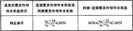 9.5.4 適宜的蒸發(fā)冷卻冷水機組形式應(yīng)根據(jù)室外空氣計算參數(shù)選用,判定條件應(yīng)符合表9.5.4的規(guī)定。
