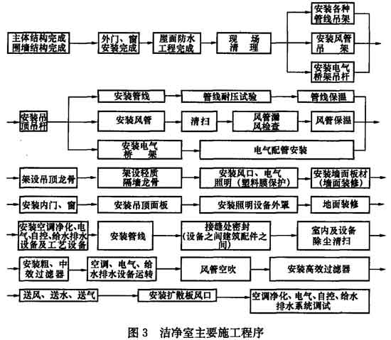 9.1.1 三級和四級生物安全實驗室是有負壓要求的潔凈室,除了在結構上要比一般潔凈室更堅固、更嚴密外,在施工方面,其他要求與空調凈化工程是基本一致的,為達到安全防護的要求,施工時一定要嚴格按照潔凈室施工程序進行,潔凈室主要施工程序參考圖3。